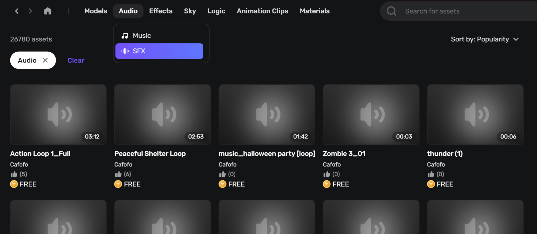 에셋 라이브러리에서 SFX를 누르면