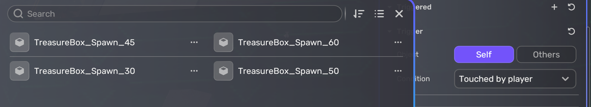 Touched by player로 설정해주면 유저가 보물과 접촉했을 때